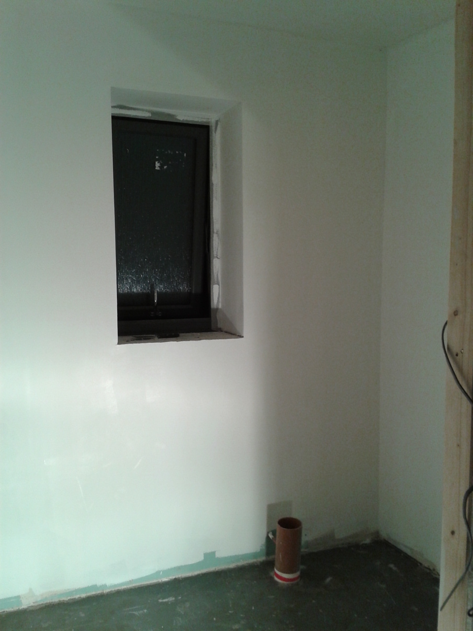 We have also made lots of progress inside. This is a picture of the bathroom, which we have Ames-taped and painted. It looks really good thanks to Barry’s skills as a plasterer. He came up to fit a kitchen, but he has spent some long days plastering the kitchen/living room and bathroom. We should have the kitchen.living room painted by the end of tomorrow.