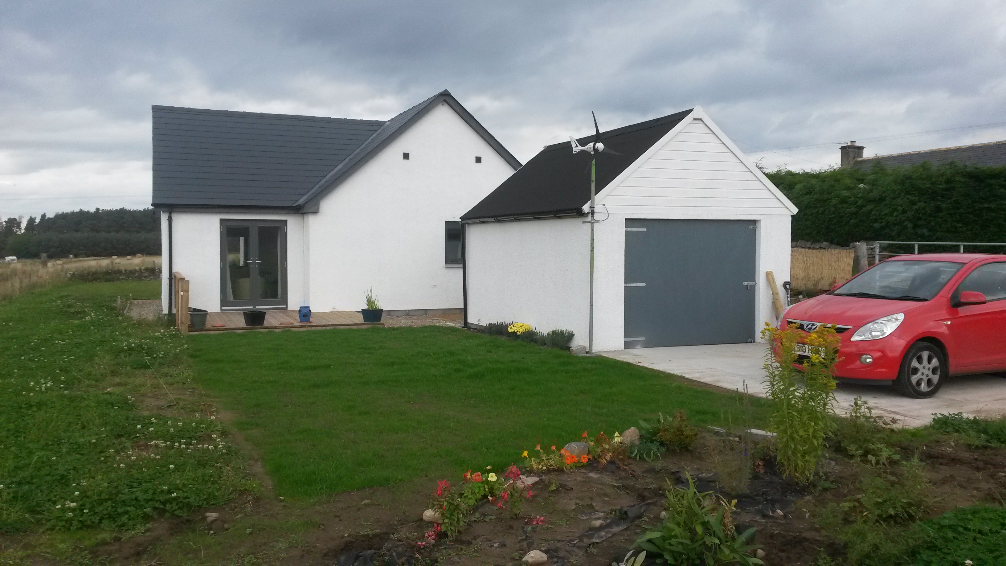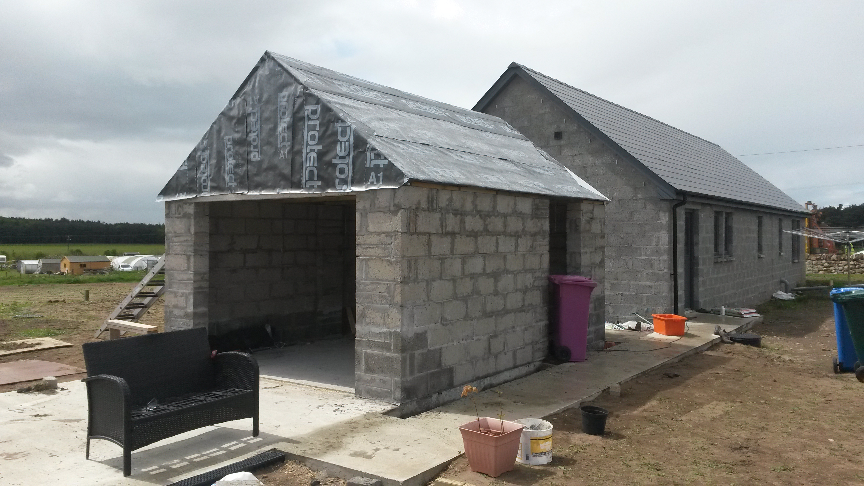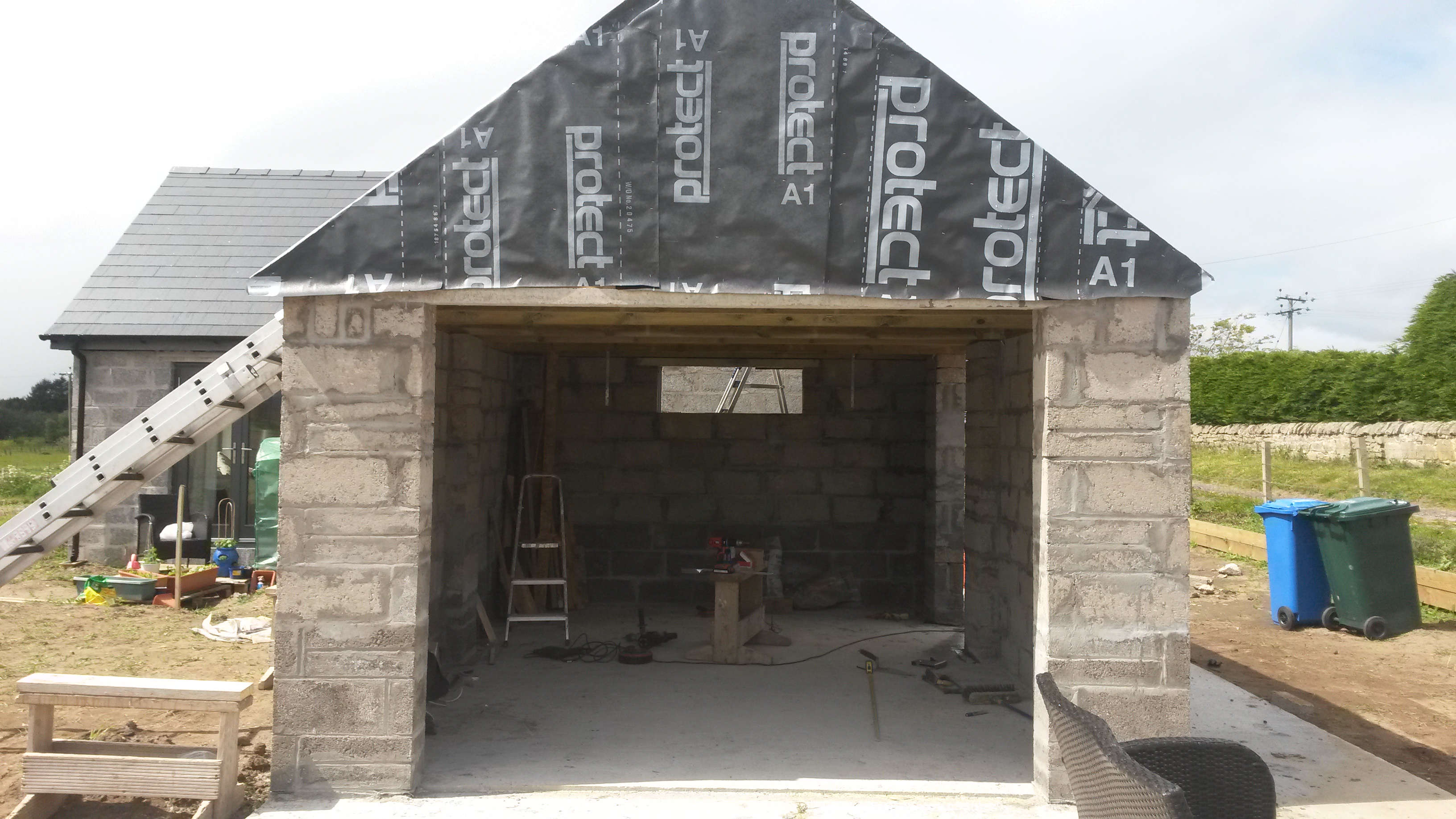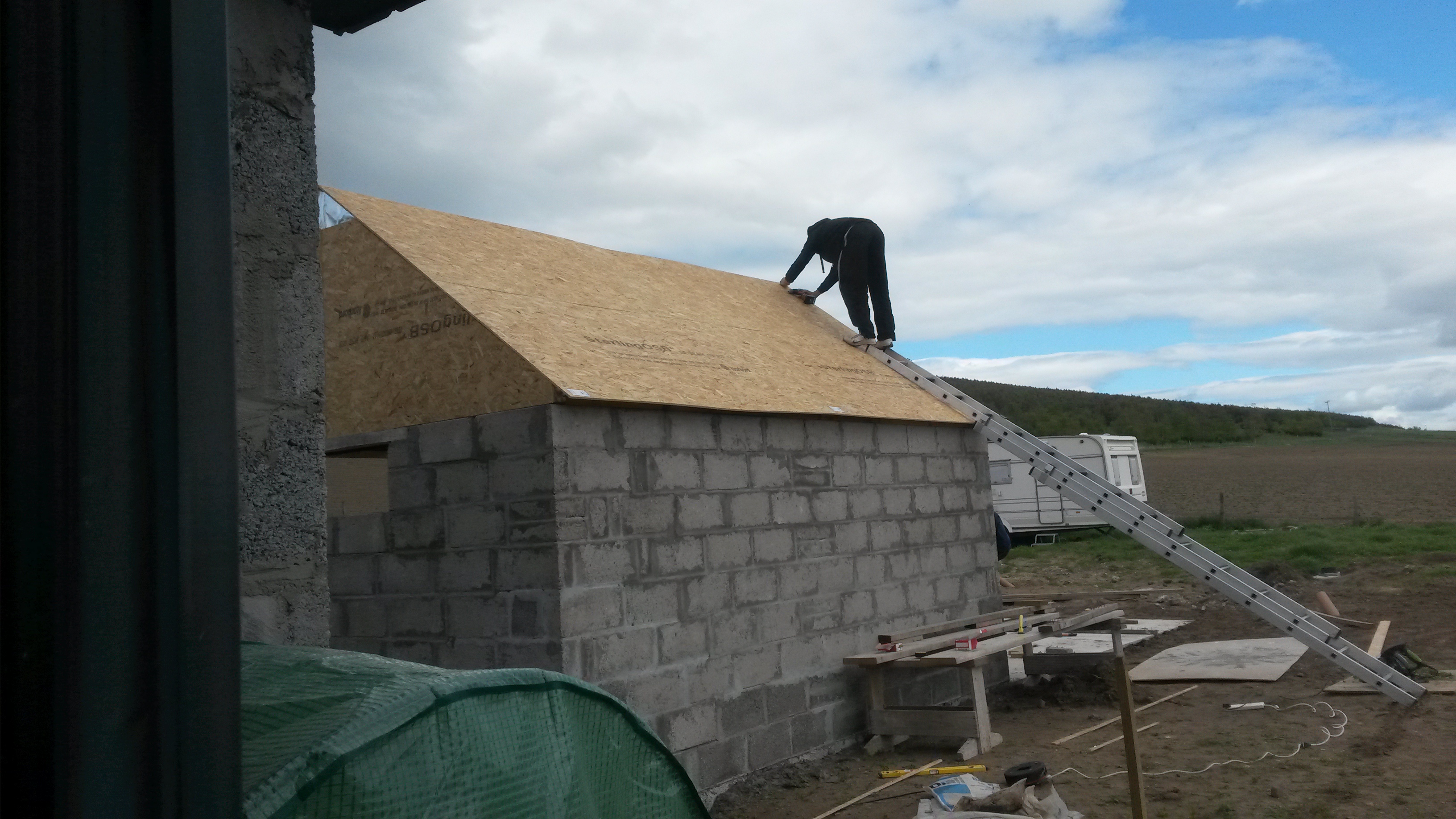 The garage is now coming along after I spent a day building blocks and making trusses. We finished the blockwork and put two trusses up on Sunday. I have put breather paper on the gable end and cut the OSB board to go on the gables. We drove into Inverness to buy the OSB board – the nearest Wickes! By the end of the weekend I am hoping to have a roof on.