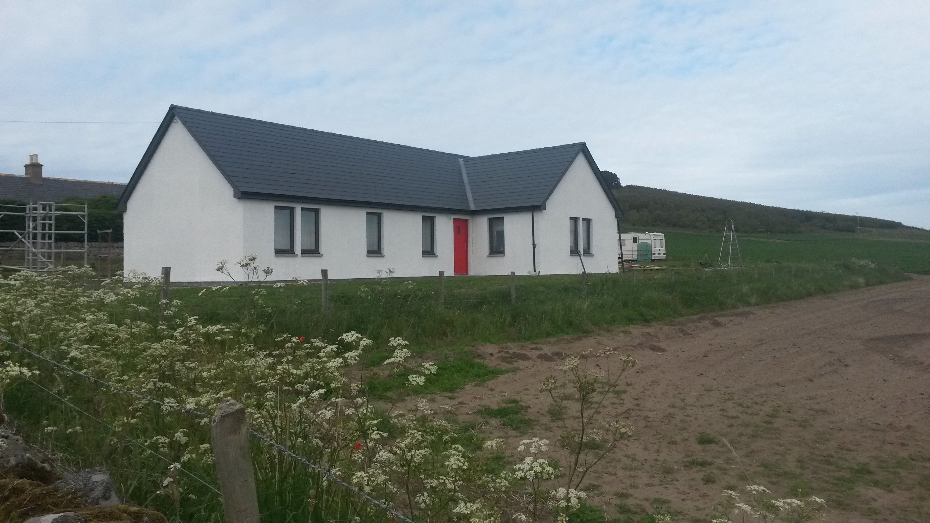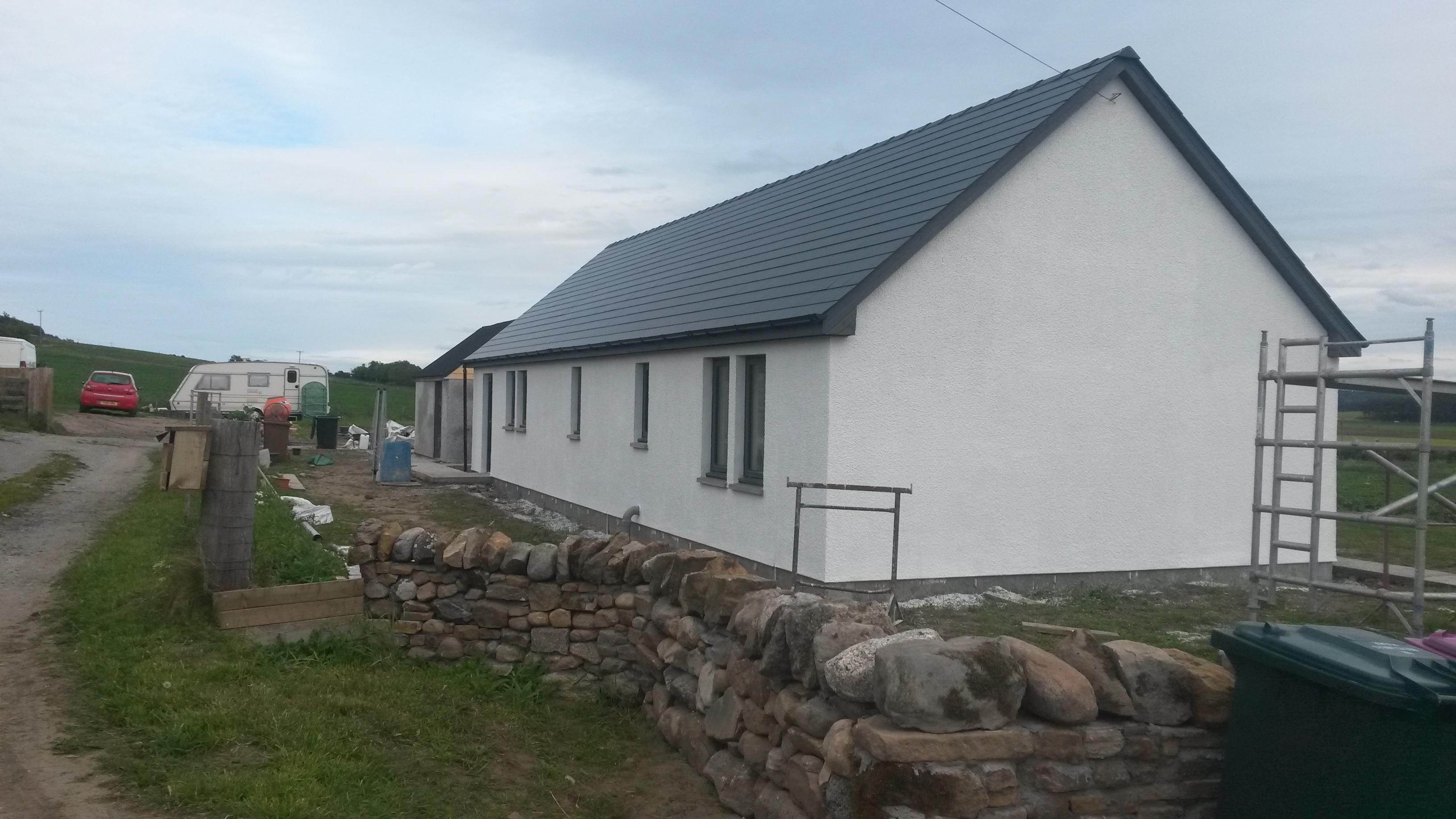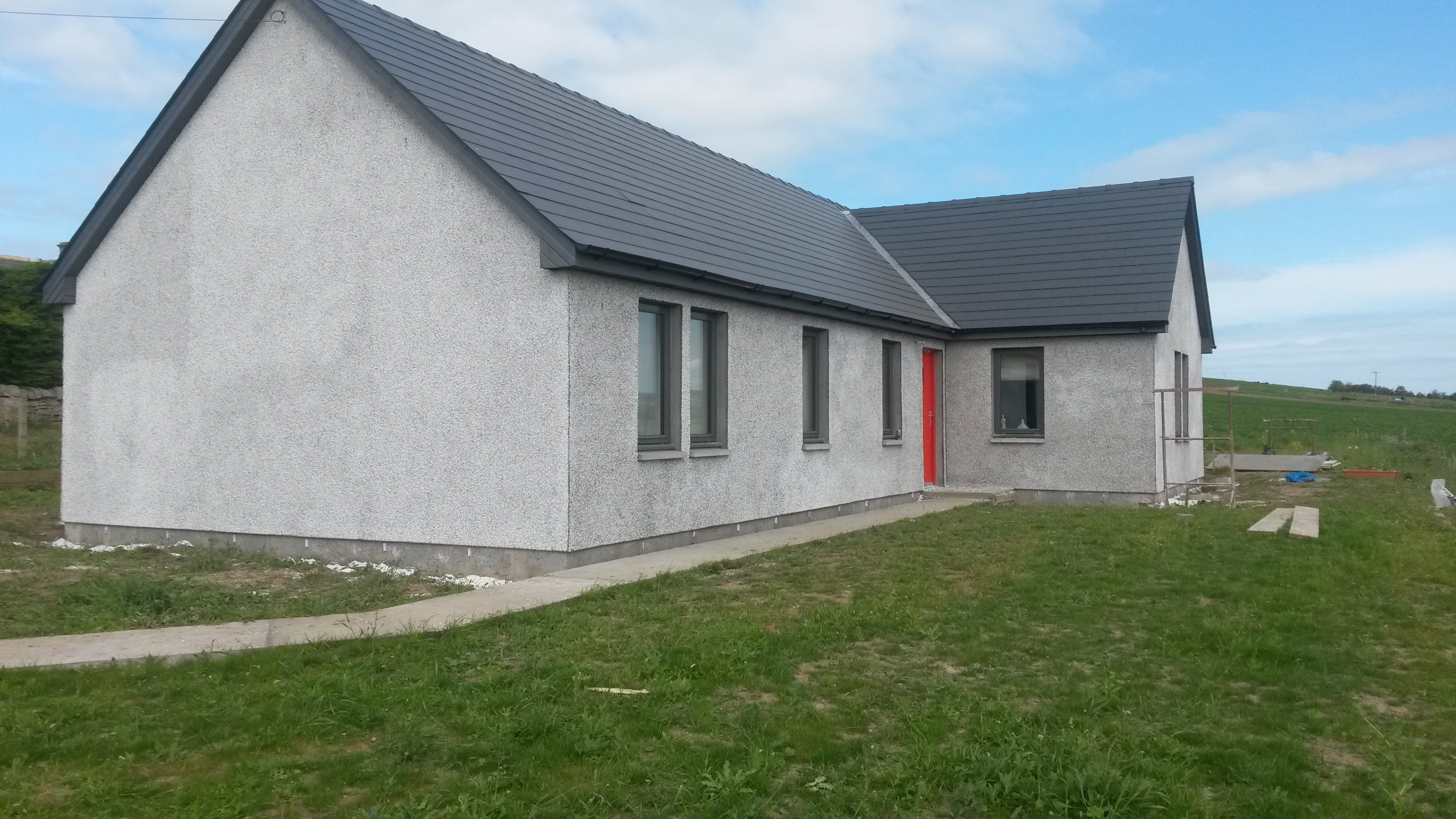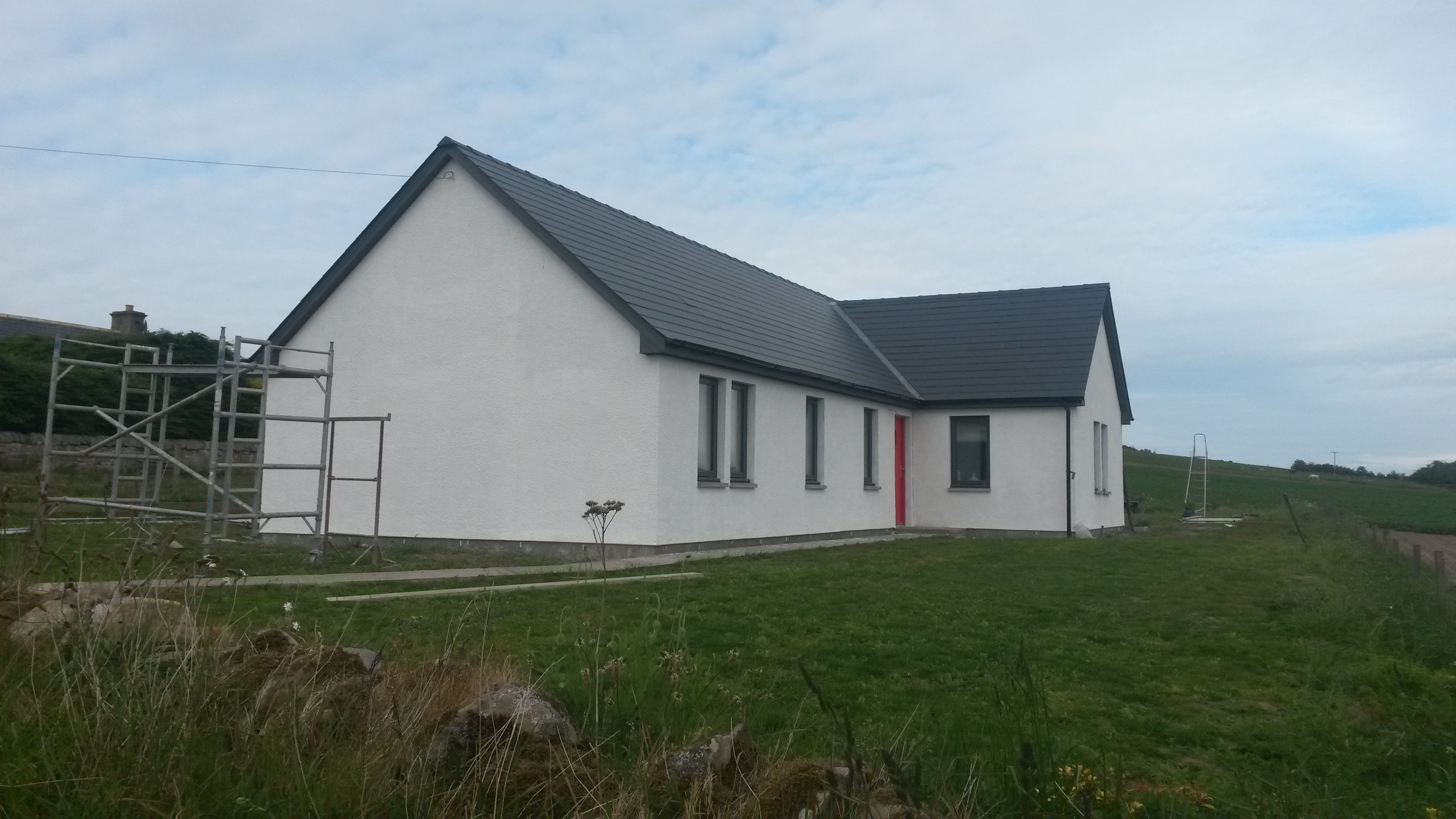 Well,we have been busy. I am almost finished with the garage roof, but the wind is gusting up to 40mph today so I have taken a break. Meanwhile Angela has been busy tiling the en-suite shower cubicle, helped occasionally by May, who has mainly been keeping us well fed and watered. Angela will finish today and I will upload the finished shower room later today. We have also had all the materials delivered for the harling (rendering) which hopefully will be done next week. Given the long-running saga of getting someone to do it I am not counting my chickens.